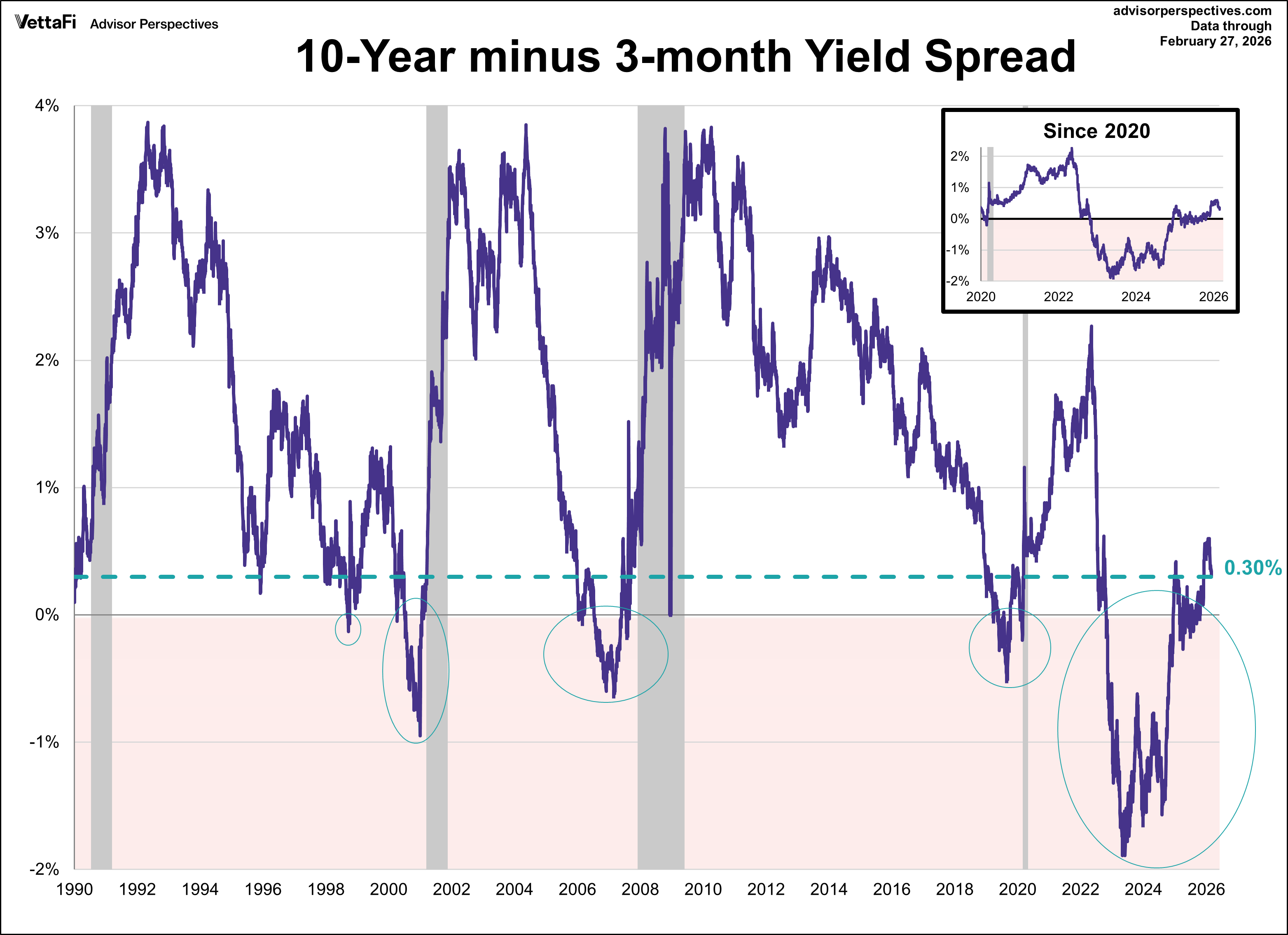 For another perspective on the yield curve, the 10-3mo spread below uses an even shorter-term maturity. The lead time to recessions based on this spread (after it turns negative) ranges from 34 to 69 weeks. Like the 10-2 spread, we see the same false positive in 1998, as well as multiple instances of the spread turning negative before rising again ahead of the 2009 recession. Recently, the spread was negative from October 25, 2022 to December 12, 2024. Since February 26th the spread has swung back and forth from positive to negative territory.
