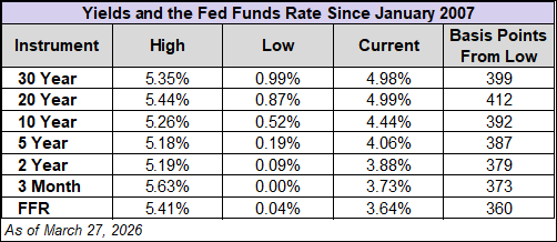 This next table shows the highs and lows of yields and the Federal Funds Rate (FFR) since 2007.