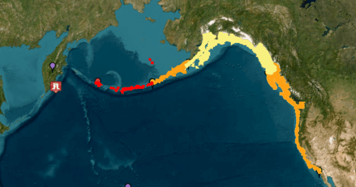 A map showing areas covered by a tsunami watch.