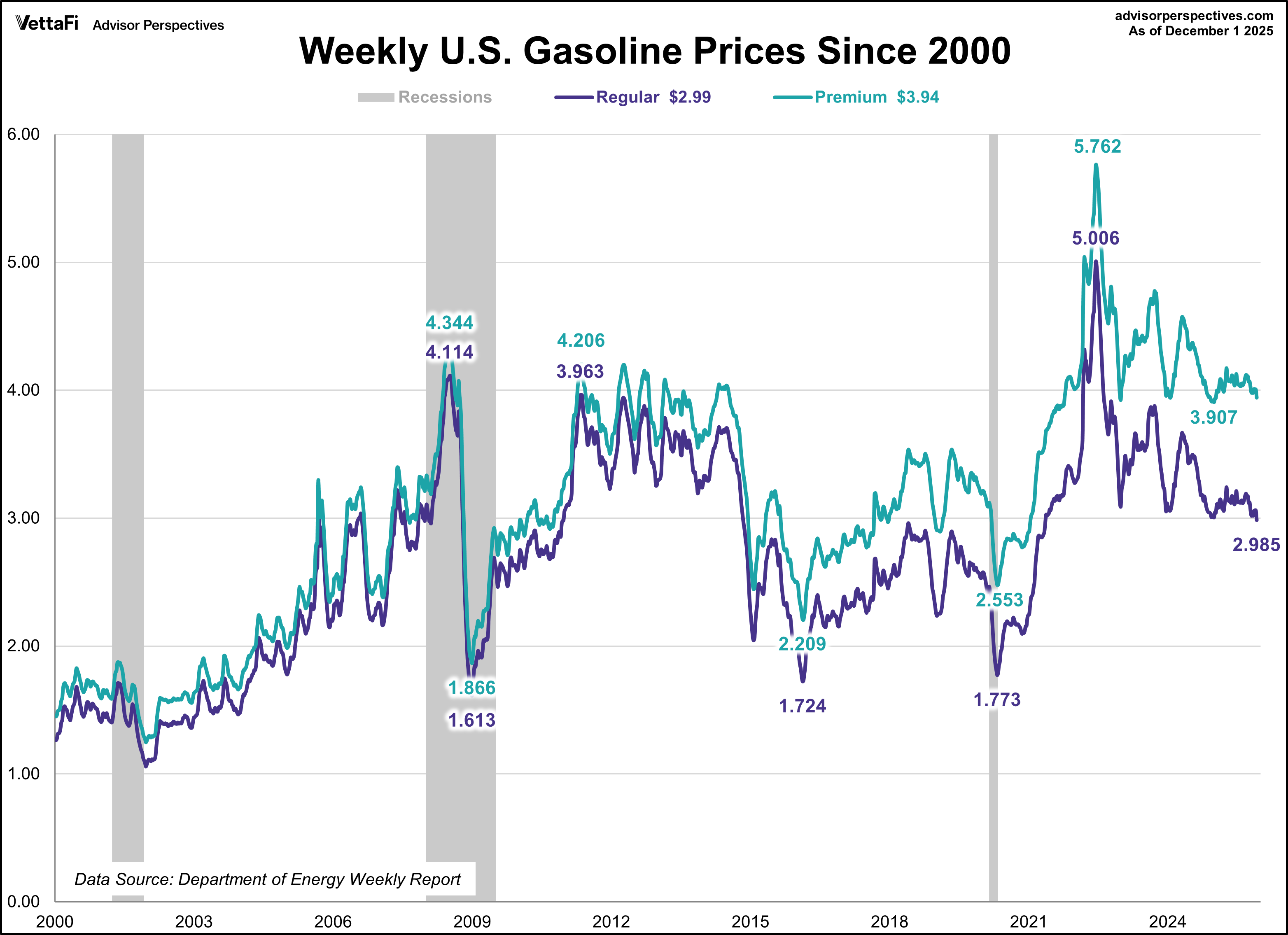 While “core” inflation helps economists identify trends, it’s easy to understand why so many people are confused by the exclusion of food and energy from core measures of inflation. After all, these are essential monthly expenses. But the extreme volatility of prices for items like gasoline, as shown in the chart below, often obscures the underlying inflationary trends that policymakers are focused on.