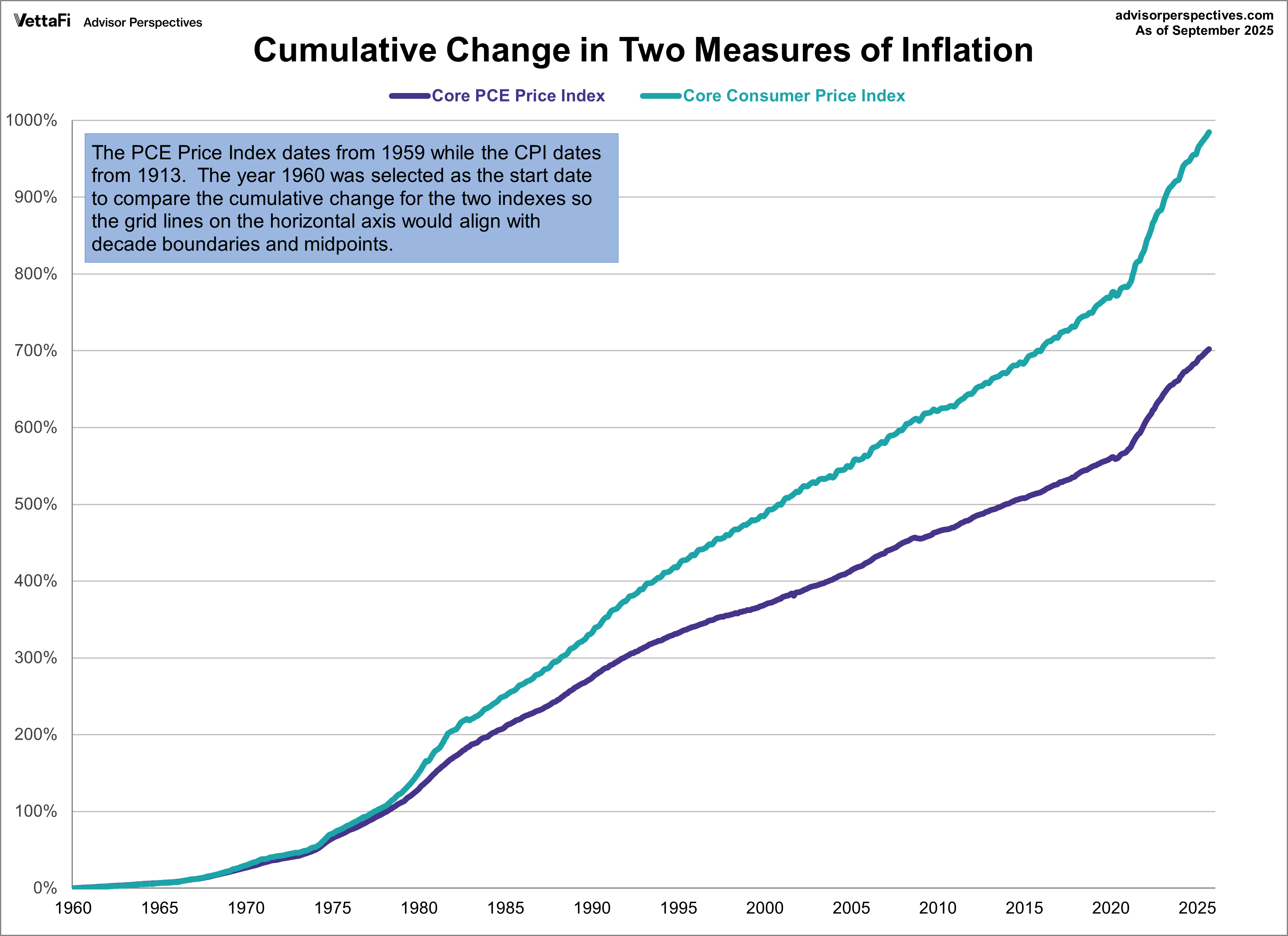 Here is a chart that helps us compare the cumulative change in the two indexes since 1960. The two grew at similar rates up until around 1980. However, over time, the core PCE indicates significantly lower inflationary growth. As of September 2025, core CPI has grown 985% since 1960, while core PCE has only grown almost 1/3 less at 702%.