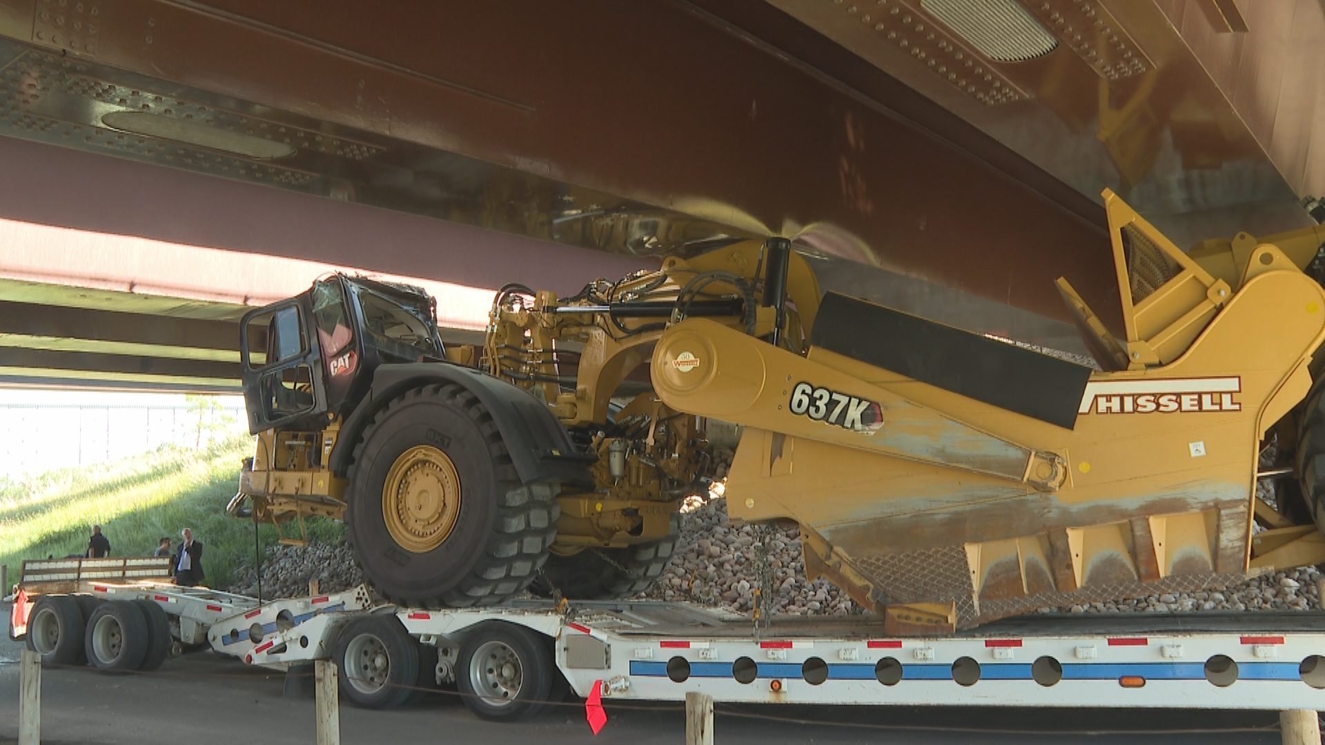 A semi-truck hauling a construction vehicle on a flatbed trailer collided with the underside of Whoop-Up Drive in Lethbridge on Wednesday morning, causing significant damage and traffic delays.