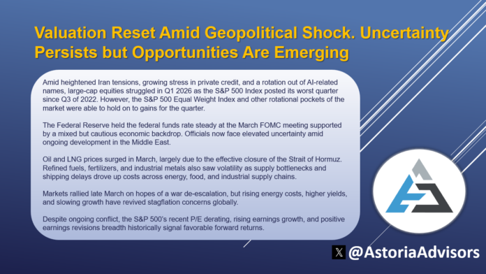 Amid heightened Iran tensions, growing stress in private credit, and a rotation out of AI-related names, large-cap equities struggled in Q1 2026. The S&P 500 Index declined 4.3%, marking its worst quarter since Q3 2022, while the tech-heavy Nasdaq 100 Index fell even further, down 5.8%. Meanwhile, the S&P 500 Equal Weight Index eked out a modest 0.7% gain. Despite a difficult March, other rotational pockets were able to hold onto gains for the quarter as US small-caps led (+3.5%), followed by international developed equities (+2.8%) and US mid-caps (+2.6%). Bonds were mixed as Treasury Inflation Protected Notes and the US Aggregate Bond Index were up marginally (+0.3% and +0.1%, respectively) while high yield credits and municipal bonds fell (-0.4% each). Commodities produced strong positive returns as crude oil rose 84.0%, broad based commodities increased 24.4%, gold was up 8.6%, and silver gained 5.8%.