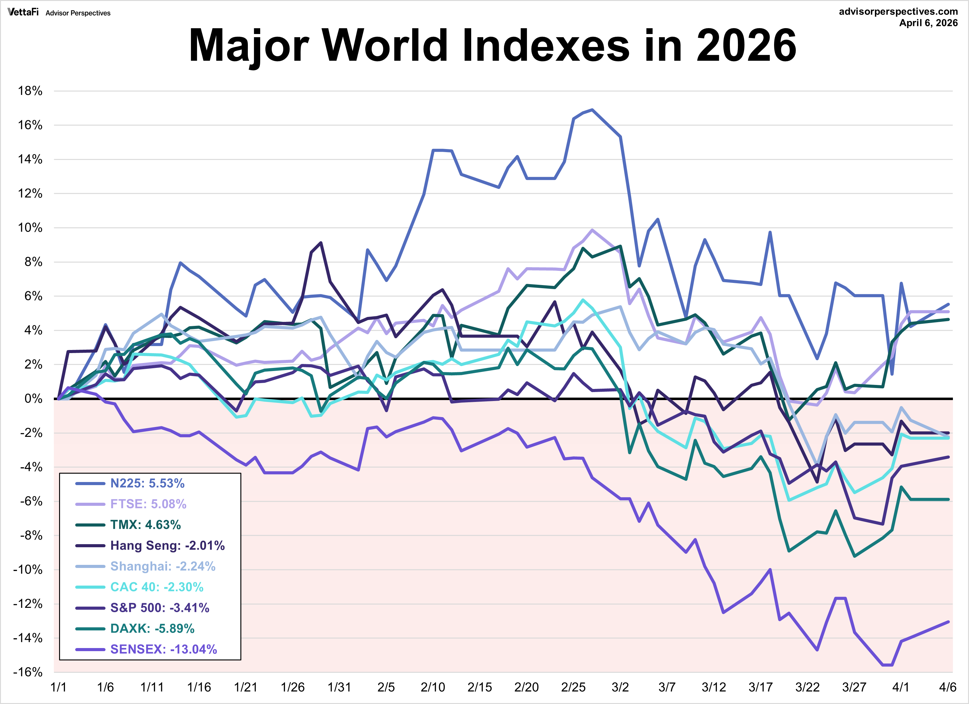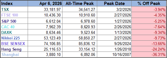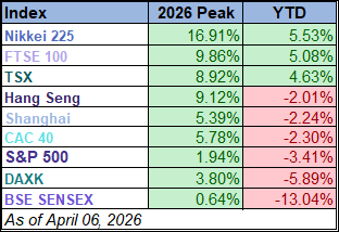 Only three of the nine indexes on our world markets watch list posted year-to-date gains through April 6, 2026. Japan’s Nikkei 225 is in the top spot with a year-to-date gain of 5.5% followed by England’s FTSE 100 with a year-to-date gain of 5.1% and Canada’s TSX with a year-to-date gain of 4.6%. On the opposite end, India’s BSE SENSEX is the index with the largest year-to-date loss, currently at -13.0%, followed by Germany’s DAXK and the U.S.’s S&P 500 with year-to-date losses currently at -5.9% and -3.4%, respectively.