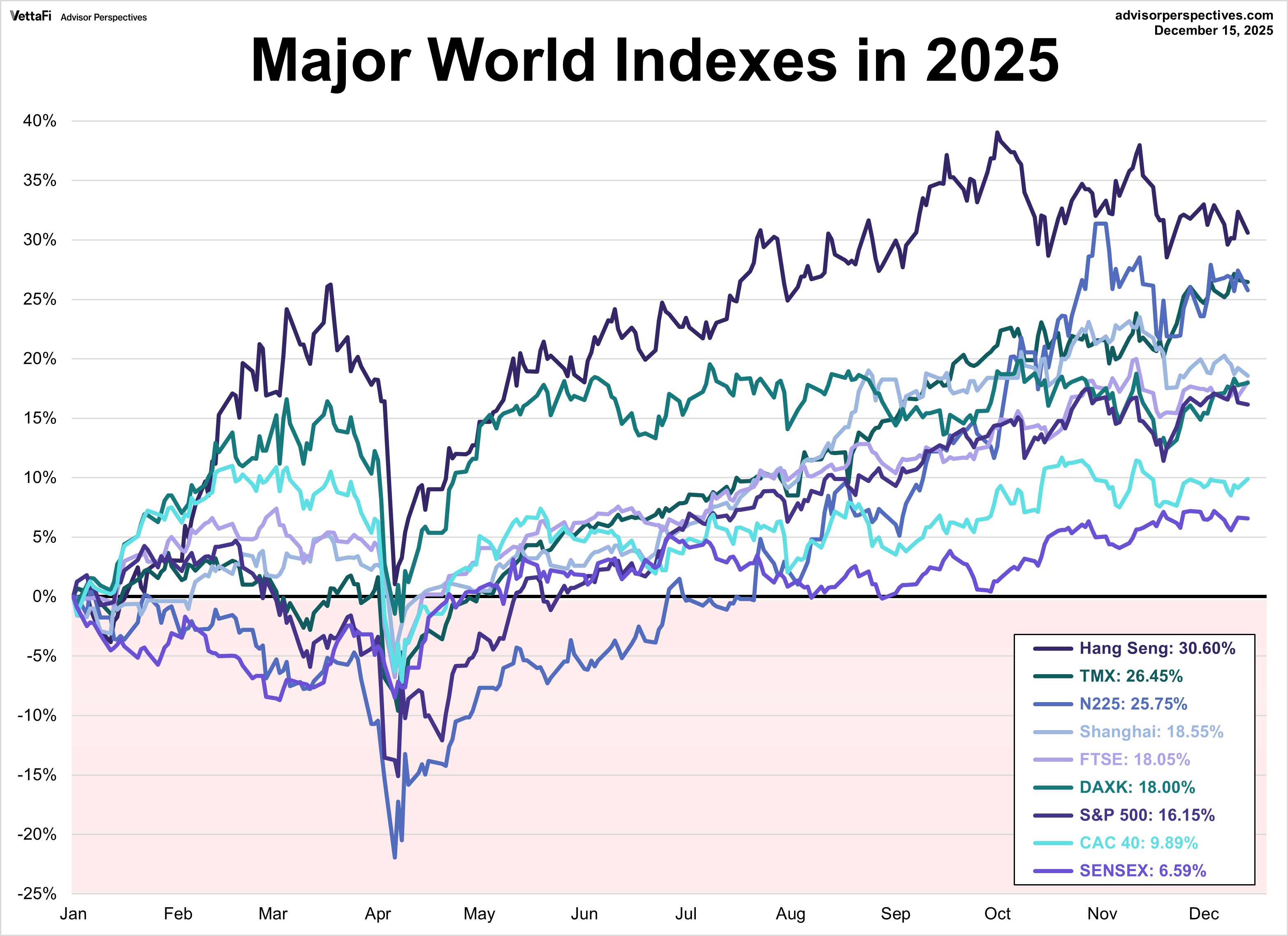 All nine indexes on our world markets watch list have posted gains through December 15, 2025. Hong Kong’s Hang Seng is in the top spot with a year to date gain of 30.6%. Canada’s TSX is in second with a year to date gain of 26.5% while Japan’s Nikkei 225 in third with a year to date gain of 25.8%. On the opposite end, India’s BSE SENSEX has posted the smallest gain on the year, currently at 6.6%.