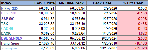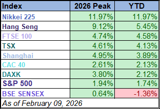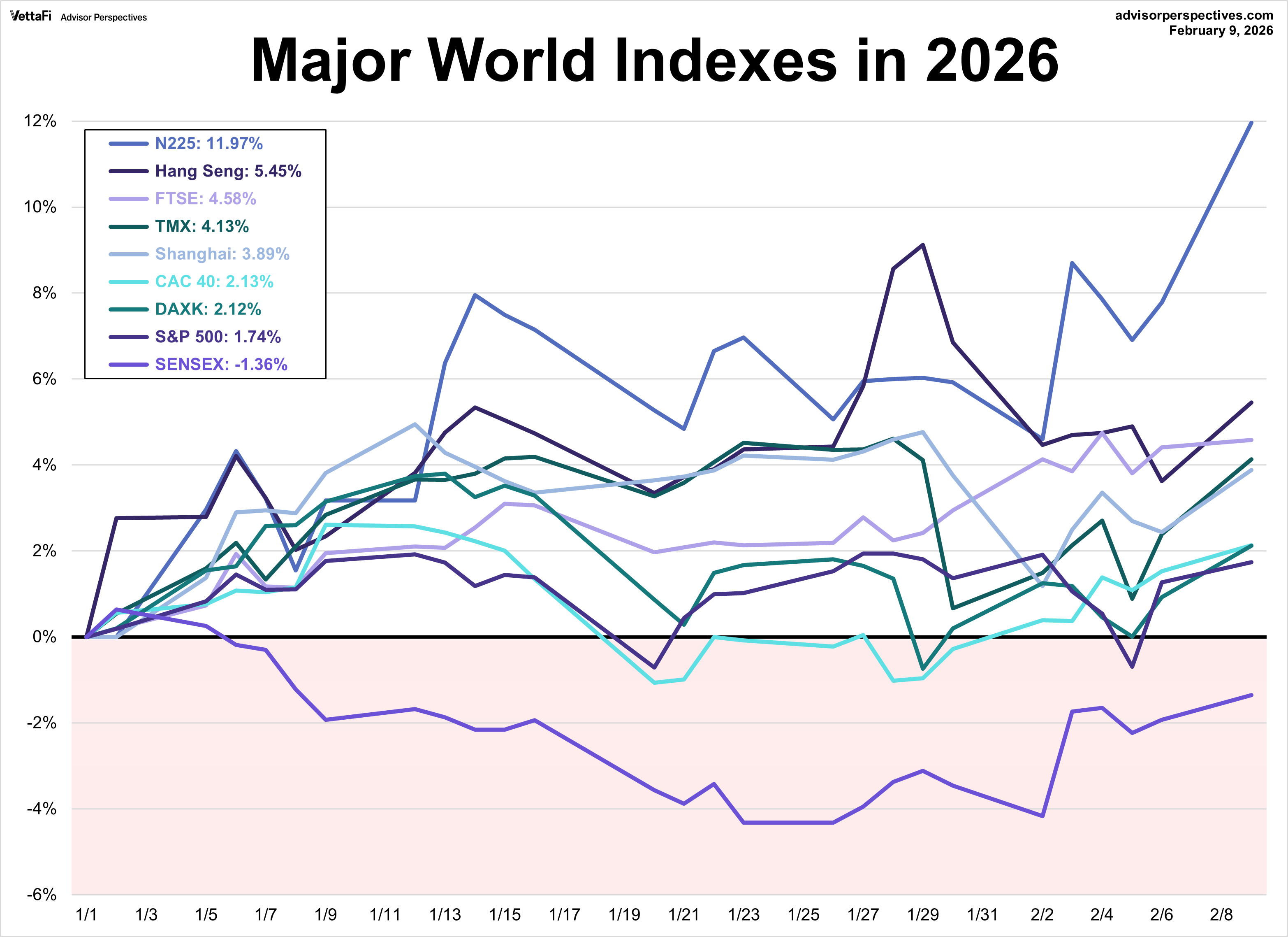 Eight of the nine indexes on our world markets watch list posted year-to-date gains through February 9, 2026. Japan’s Nikkei 225 is in the top spot with a year-to-date gain of 12.0%. Hong Kong’s Hang Seng is in second with a year-to-date gain of 5.5% while England’s FTSE 100 is in third with a year-to-date gain of 4.6%. On the opposite end, India’s BSE SENSEX is the index with the largest year-to-date loss, currently at -1.4%.