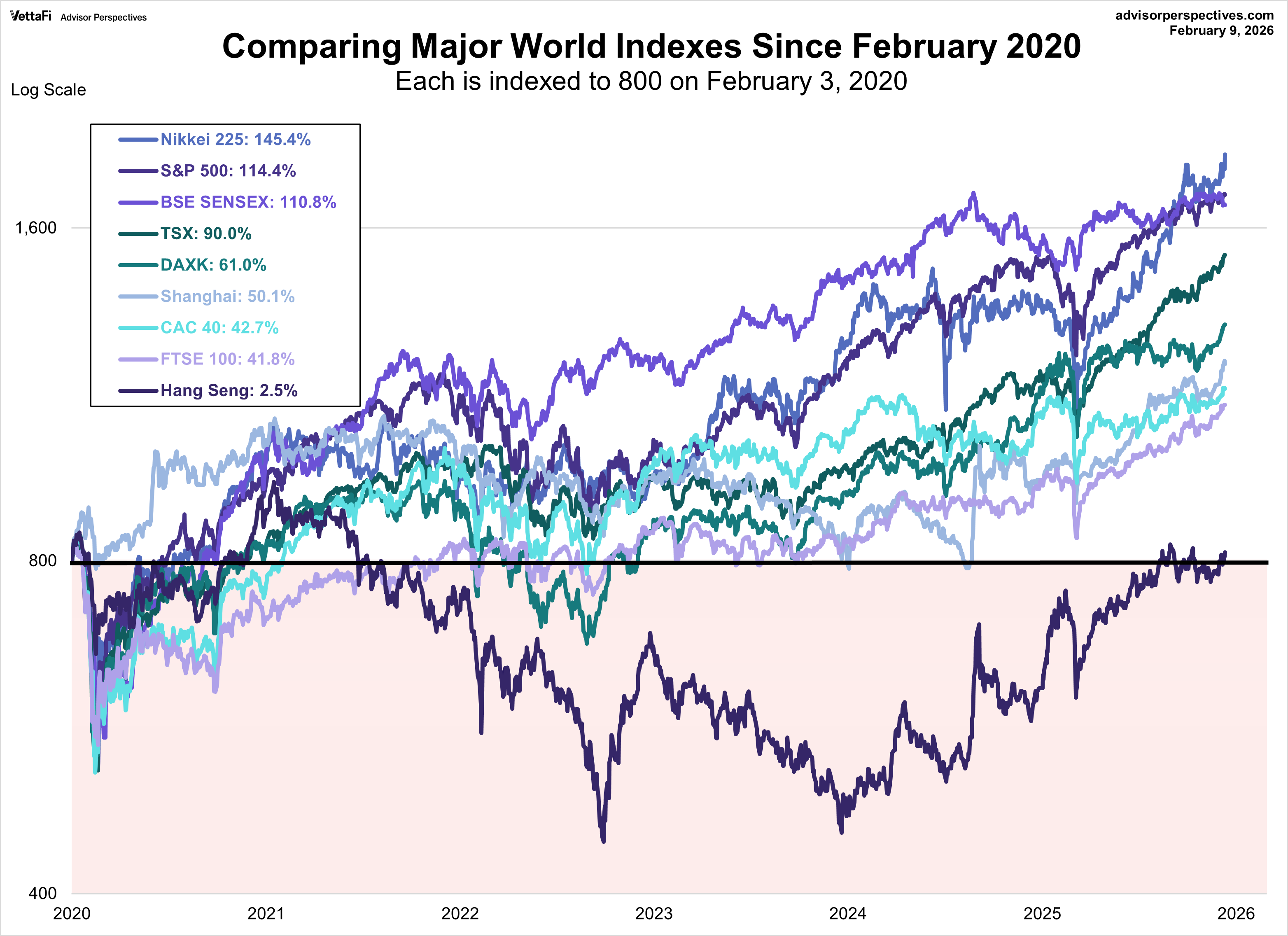 The chart below illustrates the comparative performance of world markets since March 9, 2009. The start date is arbitrary: The S&P 500, TSX, CAC 40 and BSE SENSEX hit their lows on March 9th, the Nikkei 225 on March 10th, the DAXK on March 6th, the FTSE on March 3rd, the Shanghai Composite on November 4, 2008, and the Hang Seng even earlier on October 27, 2008. However, by aligning on the same day and using a log-scale vertical axis, we get an excellent visualization of the relative performance. I’ve indexed each of the eight to 800 on the March 9th start date. The callout in the upper left corner shows the percent change from the start date to the latest weekly close.