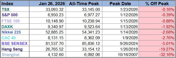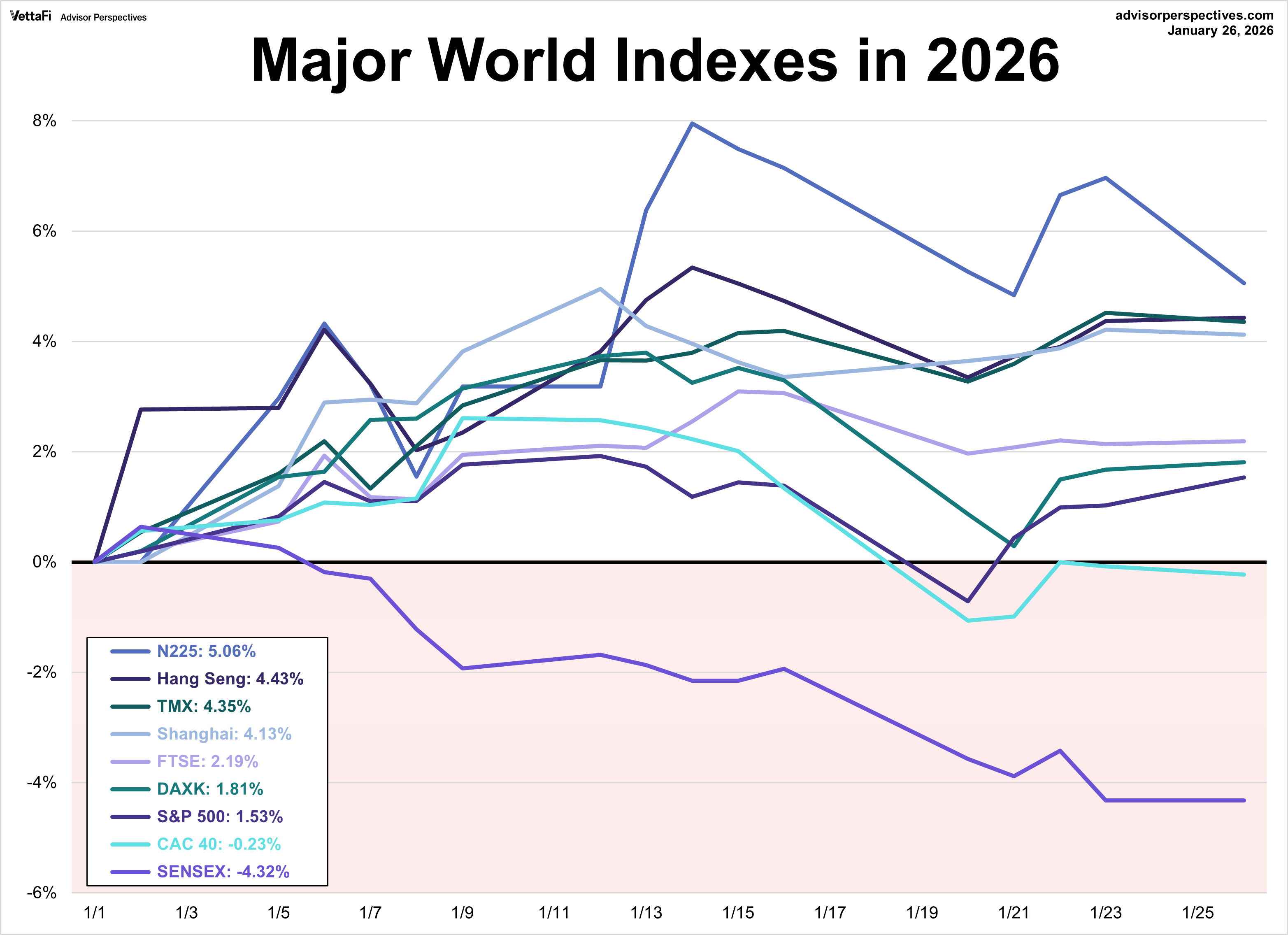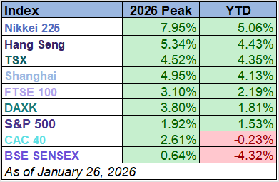 Seven of the nine indexes on our world markets watch list posted year-to-date gains through January 26, 2026. Japan’s Nikkei 225 is in the top spot with a year-to-date gain of 5.1%. Hong Kong’s Hang Seng is in second with a year-to-date gain of 4.4% while Canada’s TSX is in third with a year-to-date gain of 4.4%. On the opposite end, India’s BSE SENSEX is the index with the largest year-to-date loss, currently at -4.3%.