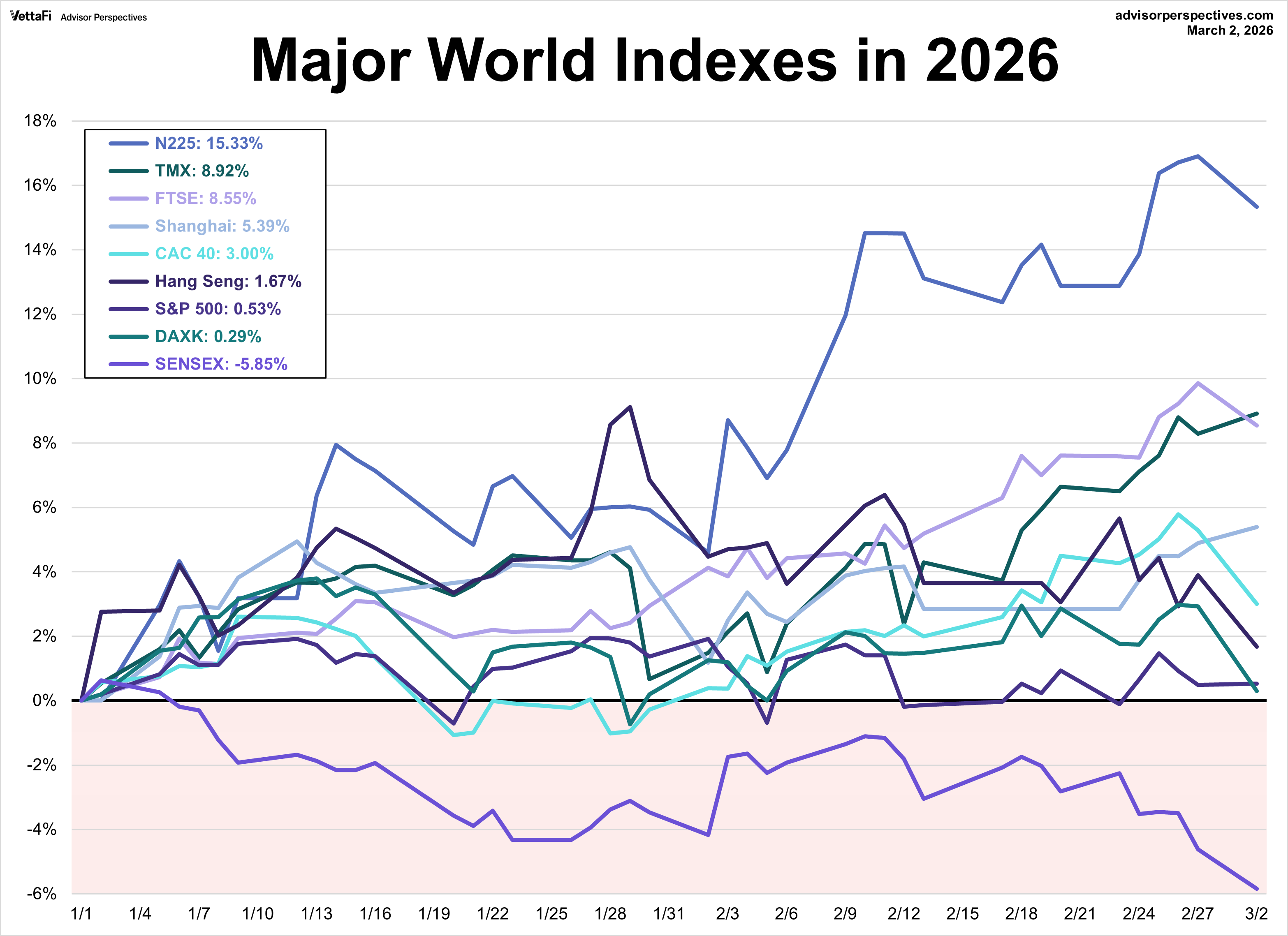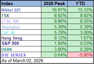Eight of the nine indexes on our world markets watch list posted year-to-date gains through March 2, 2026. Japan’s Nikkei 225 is in the top spot with a year-to-date gain of 15.3%. Canada’s TSX is in second with a year-to-date gain of 8.9% while England’s FTSE 100 is in third with a year-to-date gain of 8.6%. On the opposite end, India’s BSE SENSEX is the index with the largest year-to-date loss, currently at -5.9%.
