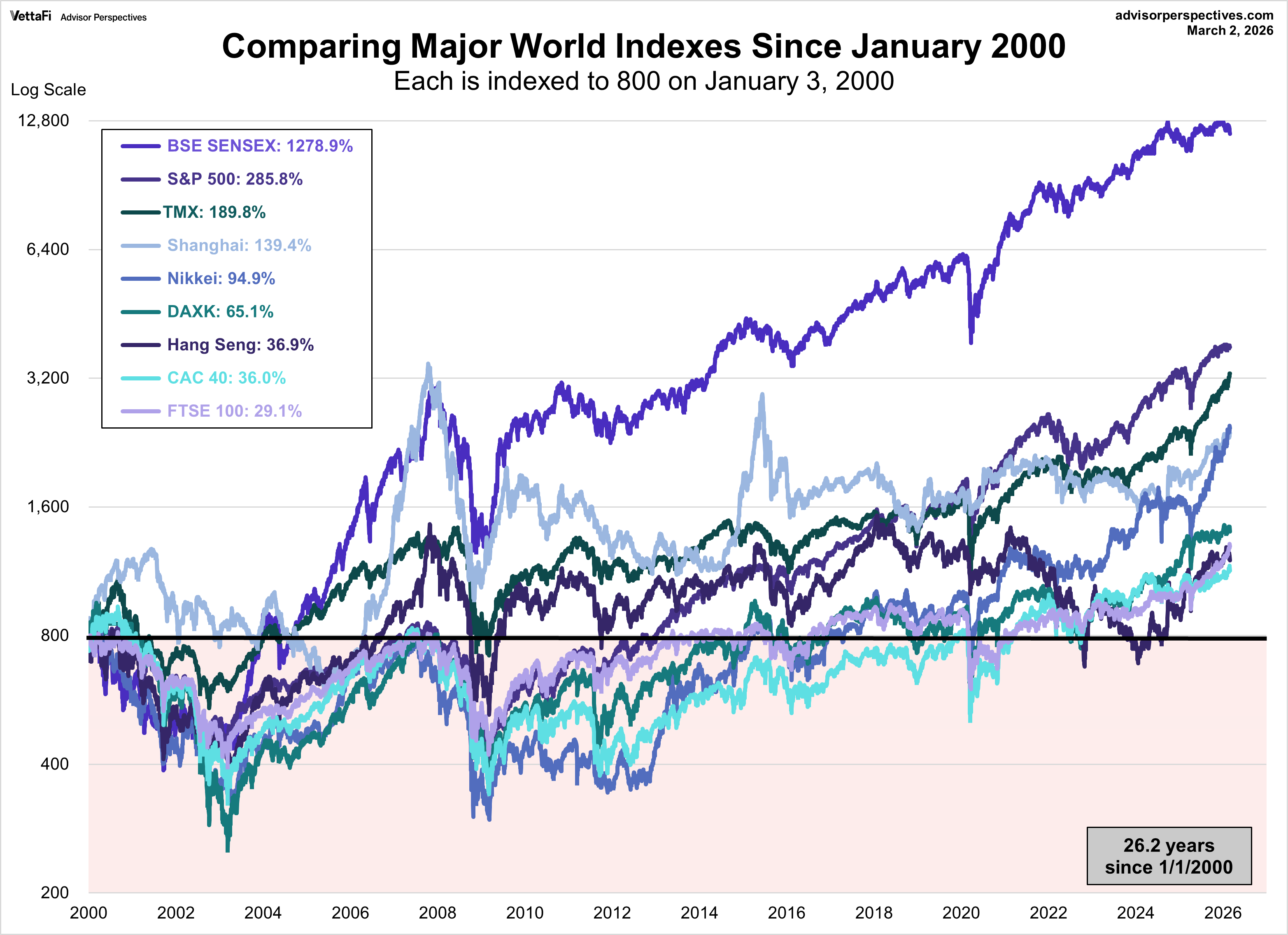 For a longer look at the relative performance, our final chart starts at the turn of the century, again indexing each at 800 for the start date.