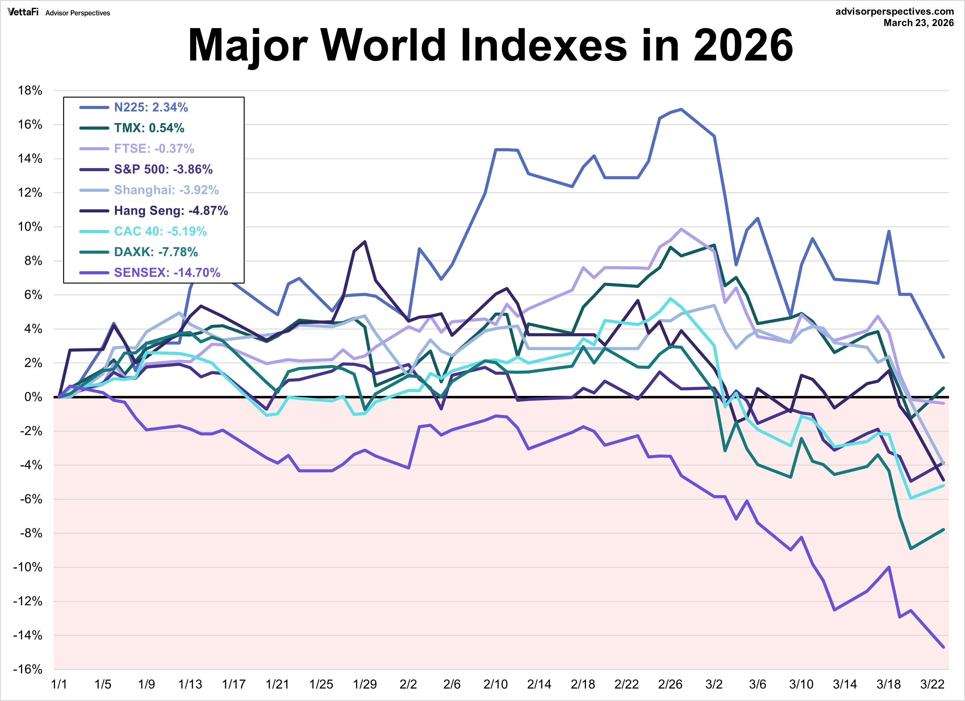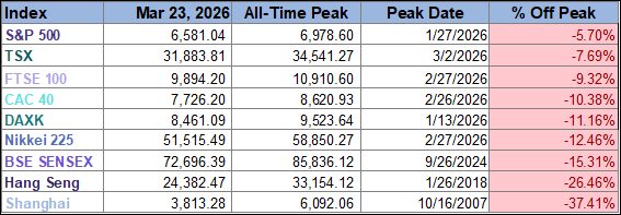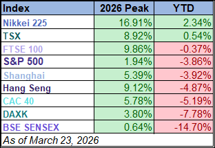 Only two of the nine indexes on our world markets watch list posted year-to-date gains through March 23, 2026. Japan’s Nikkei 225 is in the top spot with a year-to-date gain of 2.3% followed by Canada’s TSX with a year-to-date gain of 0.5%. On the opposite end, India’s BSE SENSEX is the index with the largest year-to-date loss, currently at -14.7%, followed by Germany’s DAXK and France’s CAC 40 with year-to-date losses currently at -7.8% and -5.2%, respectively.