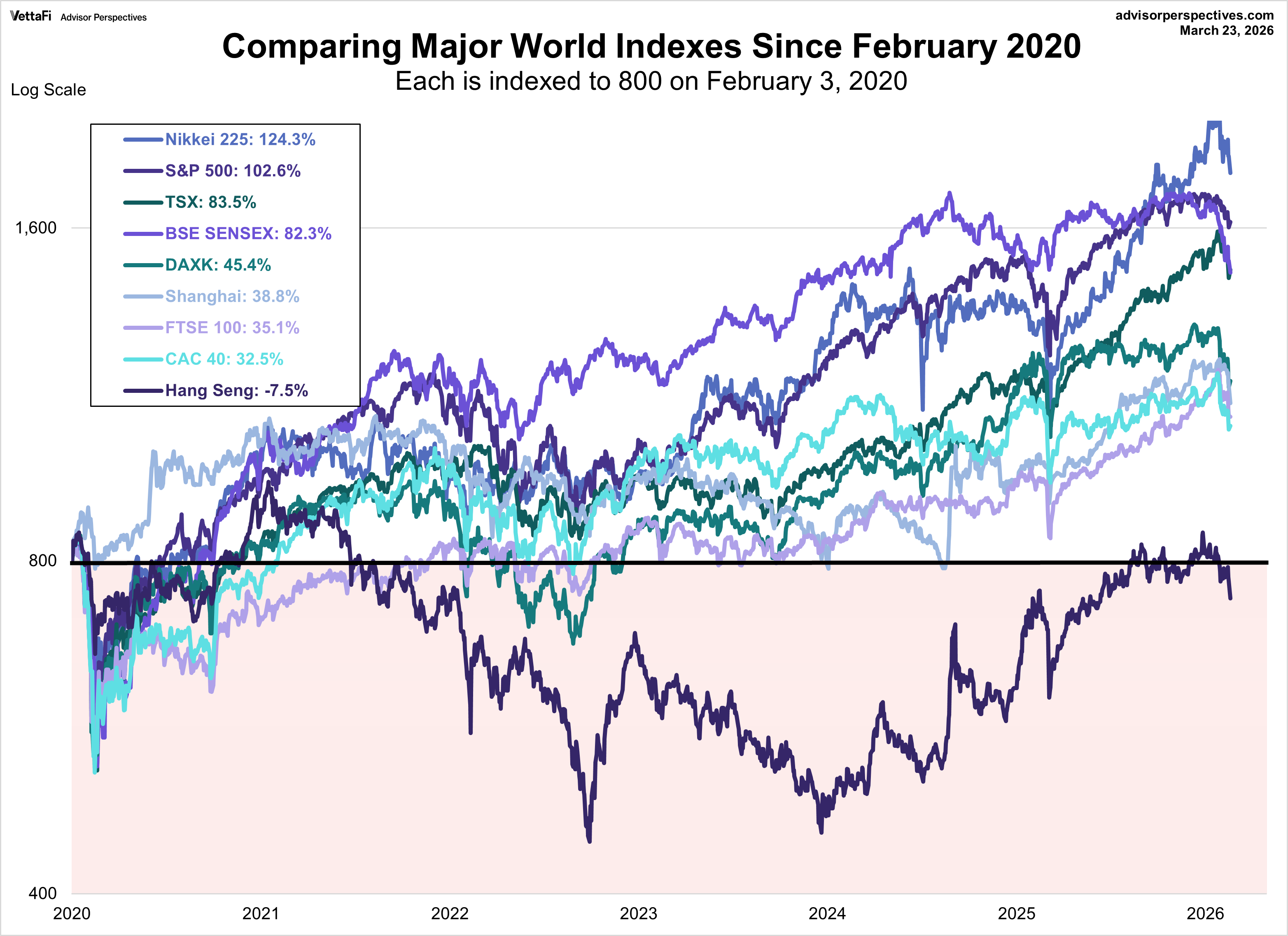 The chart below illustrates the comparative performance of world markets since March 9, 2009. The start date is arbitrary: The S&P 500, TSX, CAC 40 and BSE SENSEX hit their lows on March 9th, the Nikkei 225 on March 10th, the DAXK on March 6th, the FTSE on March 3rd, the Shanghai Composite on November 4, 2008, and the Hang Seng even earlier on October 27, 2008. However, by aligning on the same day and using a log-scale vertical axis, we get an excellent visualization of the relative performance. I’ve indexed each of the eight to 800 on the March 9th start date. The callout in the upper left corner shows the percent change from the start date to the latest weekly close.
