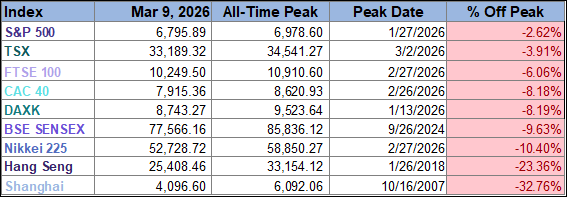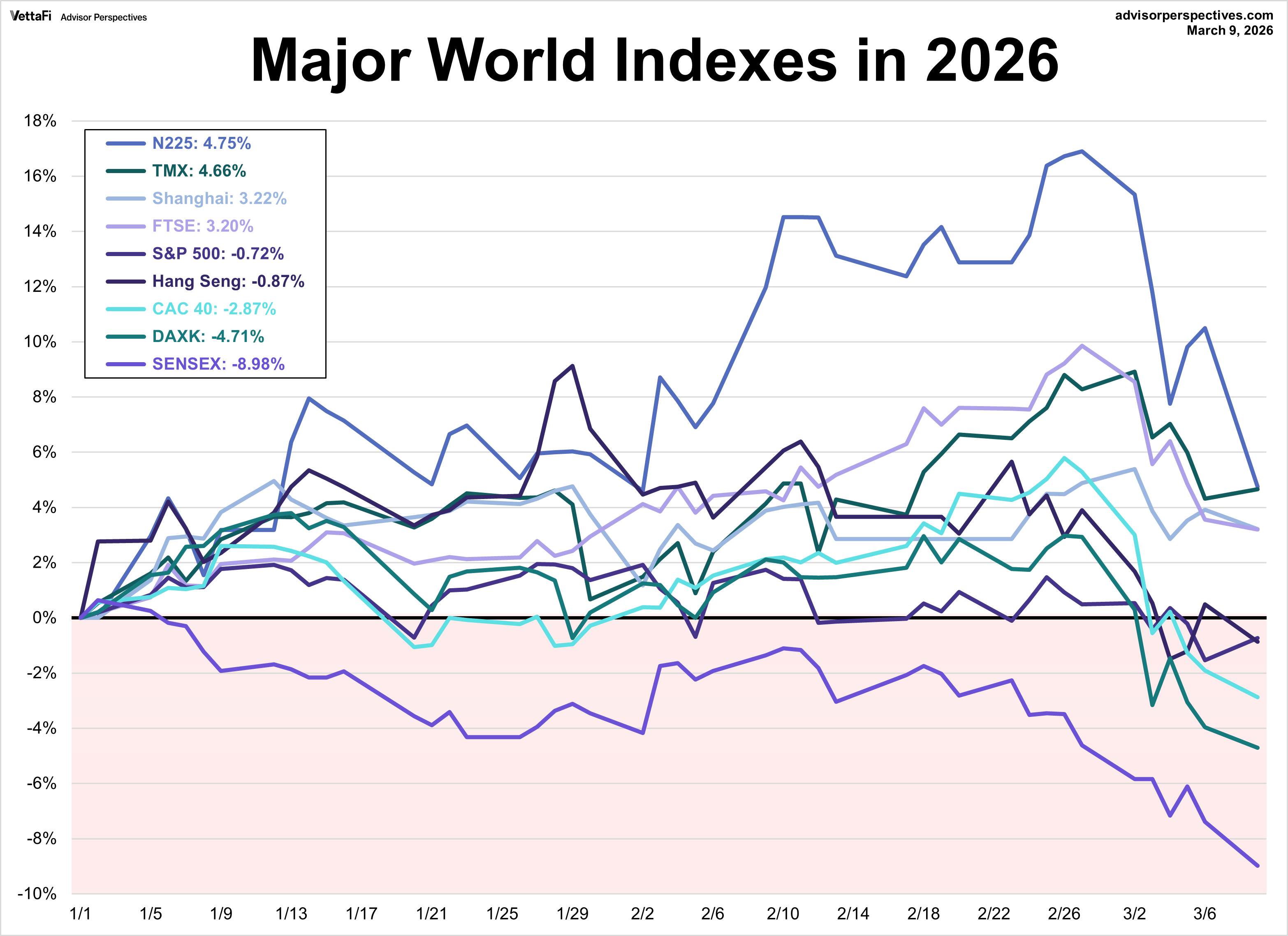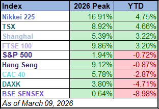 Four of the nine indexes on our world markets watch list posted year-to-date gains through March 9, 2026. Japan’s Nikkei 225 is in the top spot with a year-to-date gain of 4.8%. Canada’s TSX is in second with a year-to-date gain of 4.7% while China’s Shanghai is in third with a year-to-date gain of 3.2%. On the opposite end, India’s BSE SENSEX is the index with the largest year-to-date loss, currently at -9.0%, followed by Germany’s DAXK and France’s CAC 40 with year-to-date losses currently at -4.7% and -2.9%, respectively.